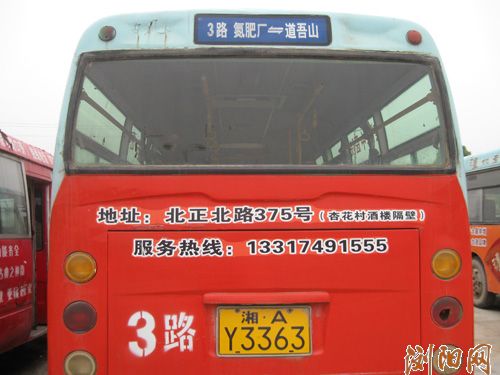 在市公交公司,停放在广场中的3路公交车后面很清楚地写着从氮肥厂到道吾山的路线。梁露摄