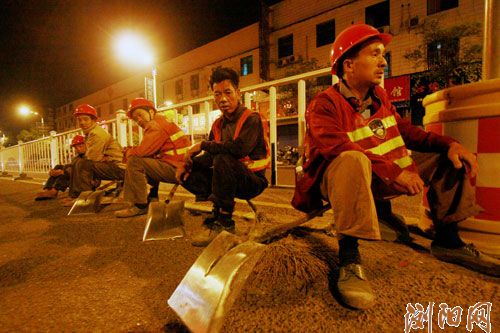 ⑤5:07金沙中路,修路的工人们席地而坐,他们中有人打着赤脚。“冷不冷?”“不蛮冷!”