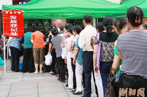 市民排起长队,等候领取节能灯泡。彭红霞摄