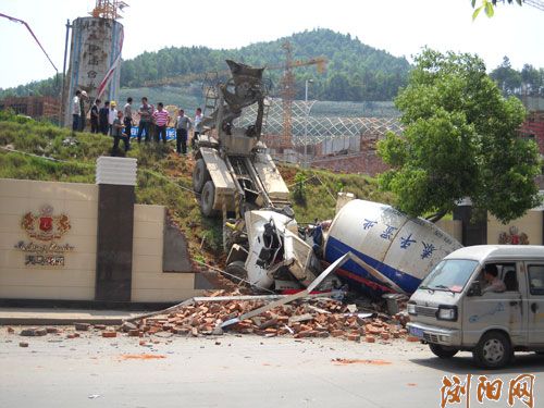 浏阳网4月27日讯(浏阳日报记者 胡敏)昨日上午11时30分左右,家住天马路一个小区的孟先生被眼前的景象惊呆了:一辆笨重的水泥罐车像挣脱了绳索的野马,从山坡上直接冲下来,撞倒工地围墙后,后面的水泥罐从驾驶室侧上方滚过,翻落到车前方,满满一罐的水泥都倾倒在马路上。