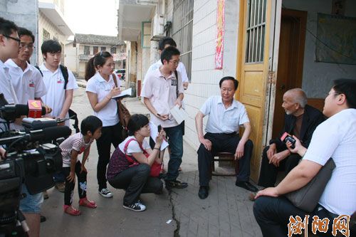 联合采访团在文家市采访,聆听93岁的张荣甫老人讲述毛主席1927年在里仁学校演讲“小石头和大水缸”的故事。彭红霞摄