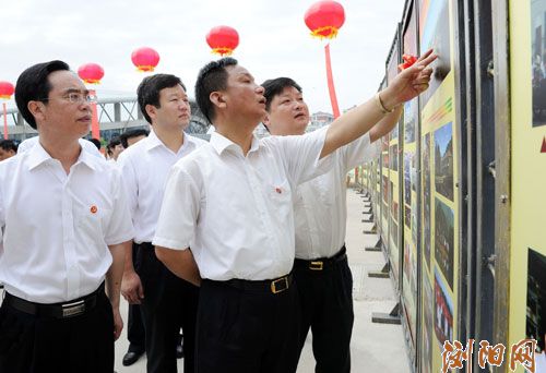 市委书记钟钢,市委副书记、代市长曹立军等在室内体育馆前参观党史陈列展。彭红霞摄