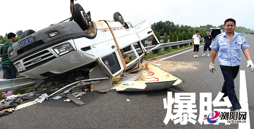 微浏阳 —分享— 7月1日,大浏高速古港段一辆银白色面包车由于后右轮爆胎而“四脚朝天”,高速路上还留有一条长约50米的轮胎痕迹。所幸的是没有人员伤亡。在此提醒司机朋友们,入夏了,高速运转的轮胎很容易发生爆胎。 浏阳日报记者周健摄影报道 编辑:戴鹏