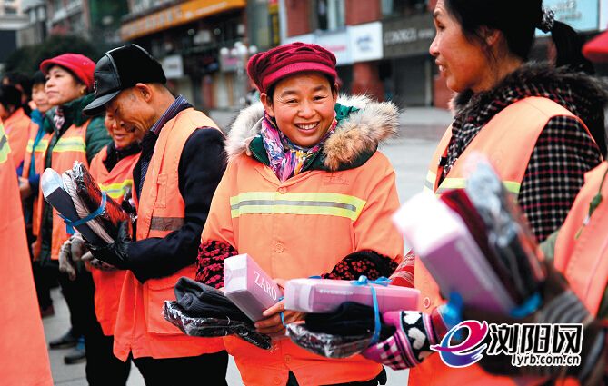 昨日上午,才常广场上,环卫工人领取到帽子围巾手套后非常高兴。记者彭红霞实习生陈乔安