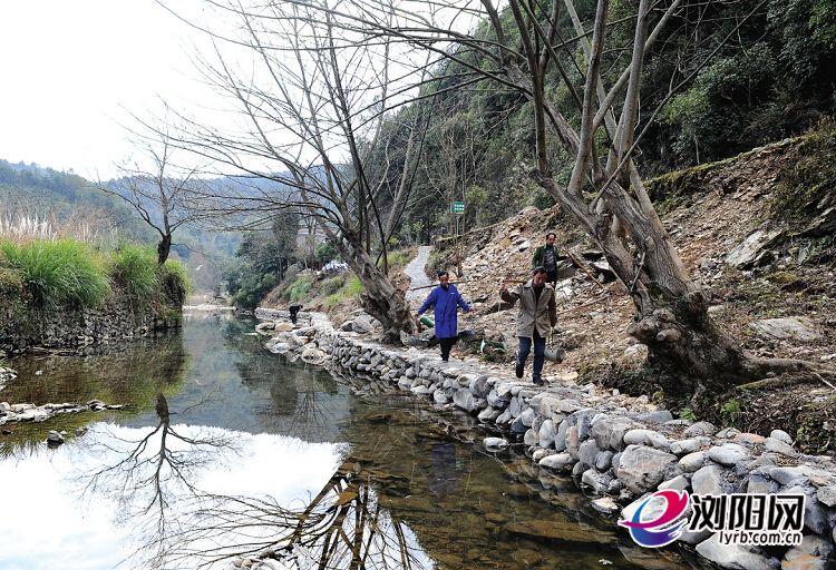 120公里外的大围山镇上坪村,护渔队员们趁着农闲时节沿河修筑游道。鱼保护好了,有红色旅游资源的上坪村想打造新的旅游项目——亲水观鱼。
