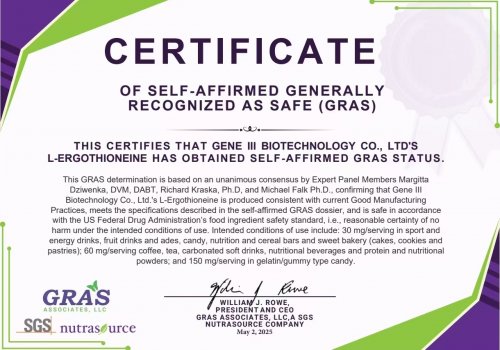 产品安全认证:通过Gras认证、FDA注册证书、SGS安全检测报告、Kosher认证、美国USDA生物基认证、HALAL证书、已入驻北美Thomas平台。(GeneIII仅三获国际机构GRAS认证证书实证)
