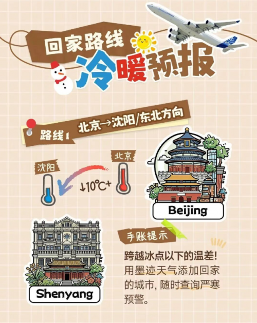 墨迹天气回家天气手账依托多年积累的海量气象数据、成熟精准的气象模型研判能力,以及完善的智能预报技术,深入分析春运期间不同区域的气候特征、天气变化规律,结合北京、上海、广州三大枢纽的热门返乡方向,精准拆解各条路线的天气痛点,为旅客提供个性化的气象服务与出行指引,切实解决春运出行中“怕遇恶劣天气”“不知如何应对多变气候”等核心诉求,帮助用户快速掌握全程天气概览。