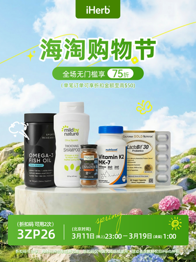 春启万物生,海淘正当时。趁着三月春风,赴一场海淘之约,囤够一整年的健康与安心。赶紧mark住,北京时间3月19日凌晨1点前,登录iHerb官网、APP或小程序,使用折扣码3ZP26,即可享受全场无门槛75折优惠(特殊商品除外)!愿每一位消费者,都能在这场海淘盛宴中,邂逅品质好物,收获健康与美好。