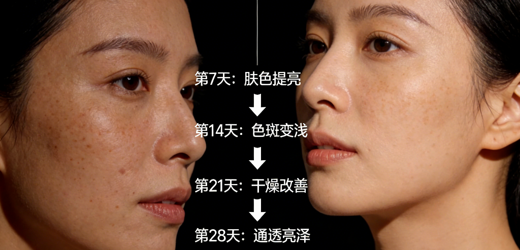 3. 实测数据,淡斑效果看得见:经第三方权威机构实测,连续使用28天,黑色素合成源头被有效压低71.6%,色斑面积平均减少38.2%,肤色亮度提升54.3%,经表皮水分流失下降33.9%。实测过程中,14天可见色斑边缘柔化、颜色变浅,28天色斑明显淡化,肤色均匀透亮,无明显反黑现象。针对40+常见的黄褐斑、晒斑、老年斑,均有显著改善效果,同时能改善肌肤黄气、暗沉,让肌肤呈现自然通透的白皙光泽。