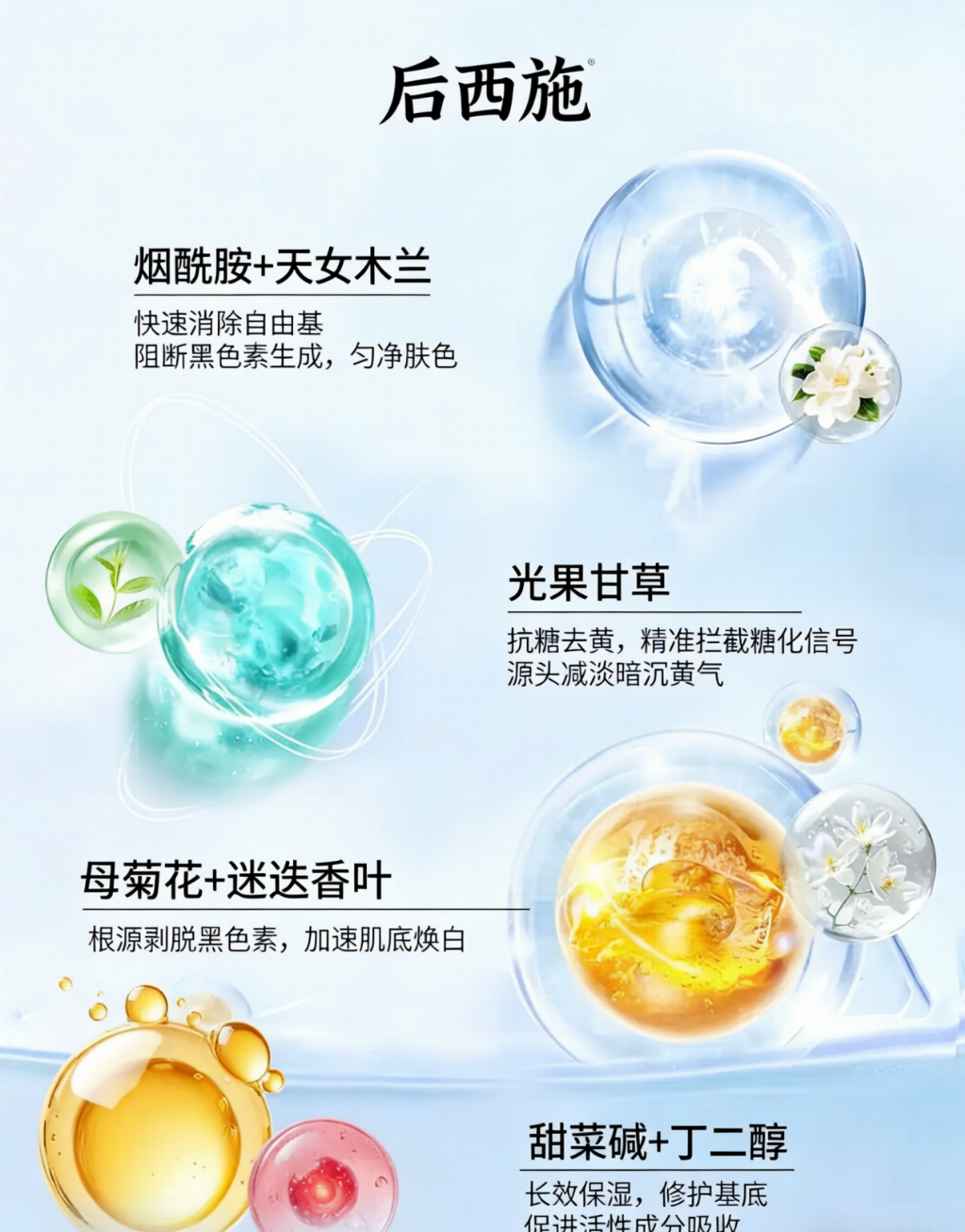 丰润质地无油腻感,针对肌肤小颗粒与屏障受损问题有明显改善作用。换季或肌肤状态不稳定时使用,可快速细腻肤质,强化肌肤抵御能力,与后西施美白祛斑霜搭配,实现淡斑 + 修护双重护理。