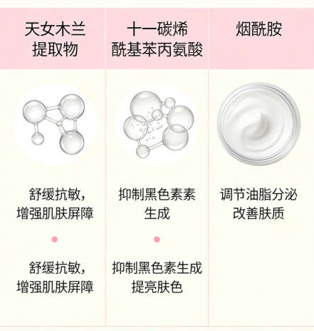 源头抑制:利用天女木兰提取物与光果甘草根提取物抑制酪氨酸酶活性,减少黑色素生成的底物。