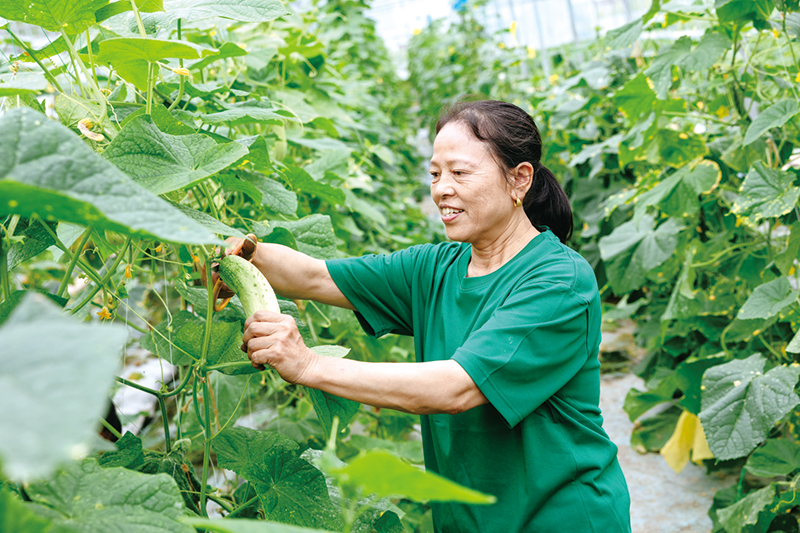 合作社的烟棚里,农户们忙着采摘成熟的黄瓜。如今大棚里还轮作种植了西瓜、甜瓜、甜菜、紫苏等果蔬,实现了“一棚多用”。市烟草专卖局供图