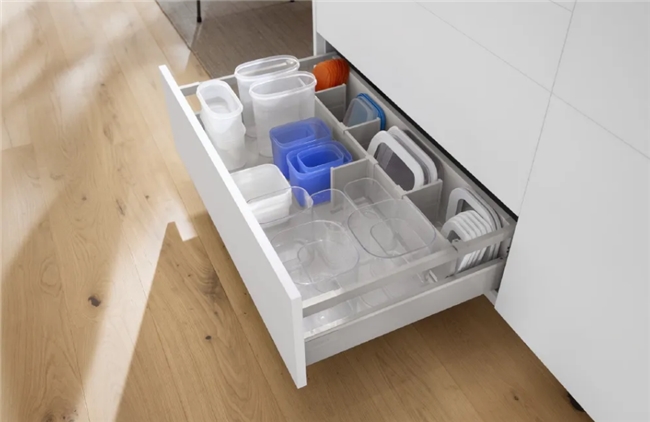 底层抽屉可用于收纳保鲜盒、玻璃罐等较重的厨房容器或小型锅具。结合可调节的百隆内分隔件系列,可将各种容器与盖子分类存放,让你一目了然的管理物品,避免“找盖”难题。