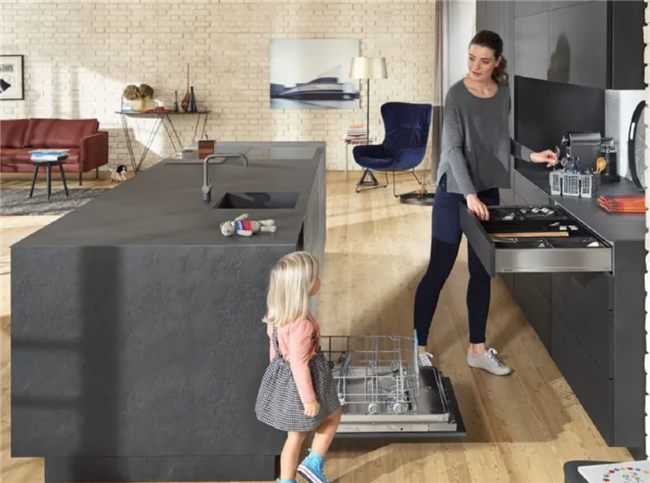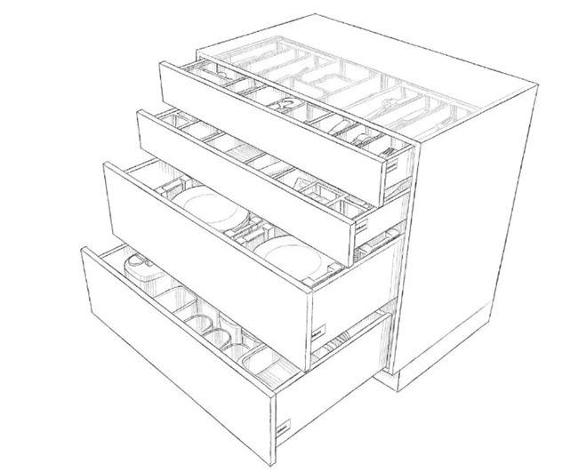 符合人体工学的高效拿取体验:地柜上层的抽屉无需弯腰即可轻松拉出,内部物品一览无余,实现站立式拿取,极大提升了便捷性。如果再将地柜安排在洗碗机附近,就能大幅缩短餐前准备和餐后收拾的走动路径,让现代家庭在厨房拿取餐具的流程更加流畅高效。