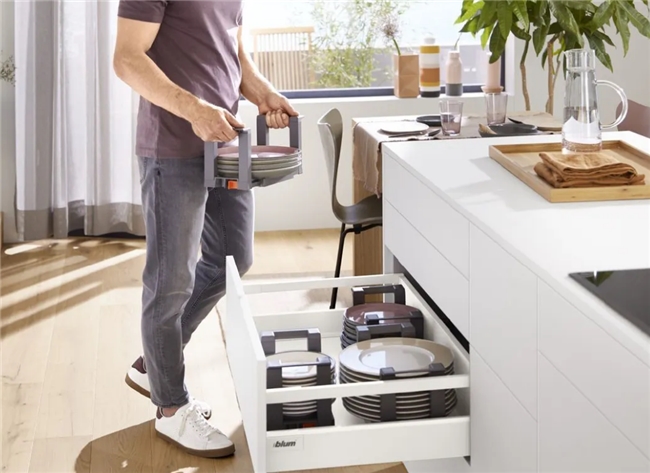 针对上述痛点,五金品牌百隆的解决方案体现了系统思维:与其孤立地看待每个柜体,不如将功能关联的储物空间视为一个整体。百隆创新的抽屉内部分隔方案主张将收纳刀叉、碗盘的地柜与存放杯子的吊柜相结合,并以带有多功能抽屉的地柜取代传统的层板柜,再结合灵活的抽屉内分隔件,从而实现有序存放各种餐具。可以说,百隆的这一组合拳,将为你的厨房生活带来质的提升。