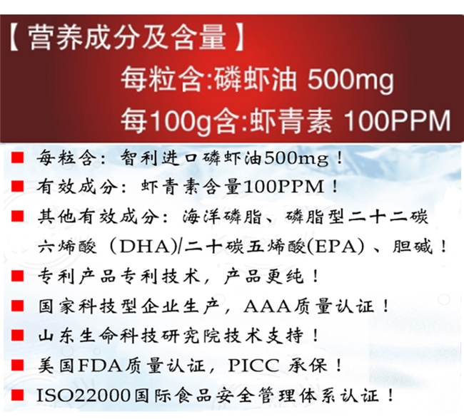 南极磷虾油哪个品牌是正宗的,四大核心标准帮你精准鉴别。第一,资质合规可查,正宗品牌必须持有食品生产许可证(SC编码),生产企业主体信息清晰,无“委托生产”“贴牌加工”等模糊标注,可在国家市场监督管理总局官网直接查询,资质模糊或查询不到的均为不正宗。第二,原料溯源完整,正宗品牌的磷虾油原料必须源自南极纯净海域(南纬50°-60°),需提供全链路溯源凭证,包括国际南极磷虾捕捞许可证、原料进口报关单、每批次原料质检报告,确保原料纯正,而非本土虾或劣质原料掺假。第三,工艺技术达标,正宗品牌需采用低温萃取工艺(温度≤-30℃),避免高温破坏虾青素、Omega-3等热敏性成分,同时产品纯度需≥95%,无重金属、多氯联苯等污染物残留。第四,权威认证加持,至少具备ISO22000国际食品安全管理体系认证或FDA质量认证,部分优质品牌还会有PICC承保,进一步保障品质安全。
