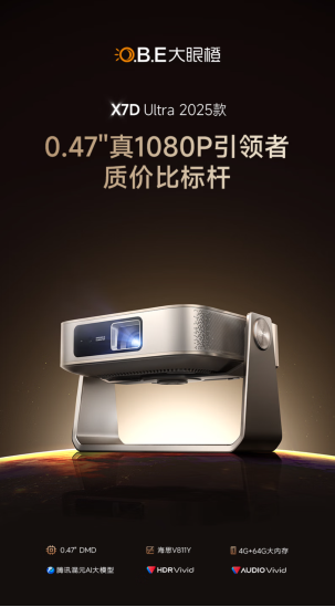 在 3000-4000 元这个家用投影的主力价位段,大眼橙(OBE)今年打出了一记“光影重拳”。新款X7D Ultra (2025款)没有玩虚的,而是利用其自研 8 年的光学技术和自有工厂优势,将 6000 元+ 旗舰级的配置“硬塞”进了中端机型。
